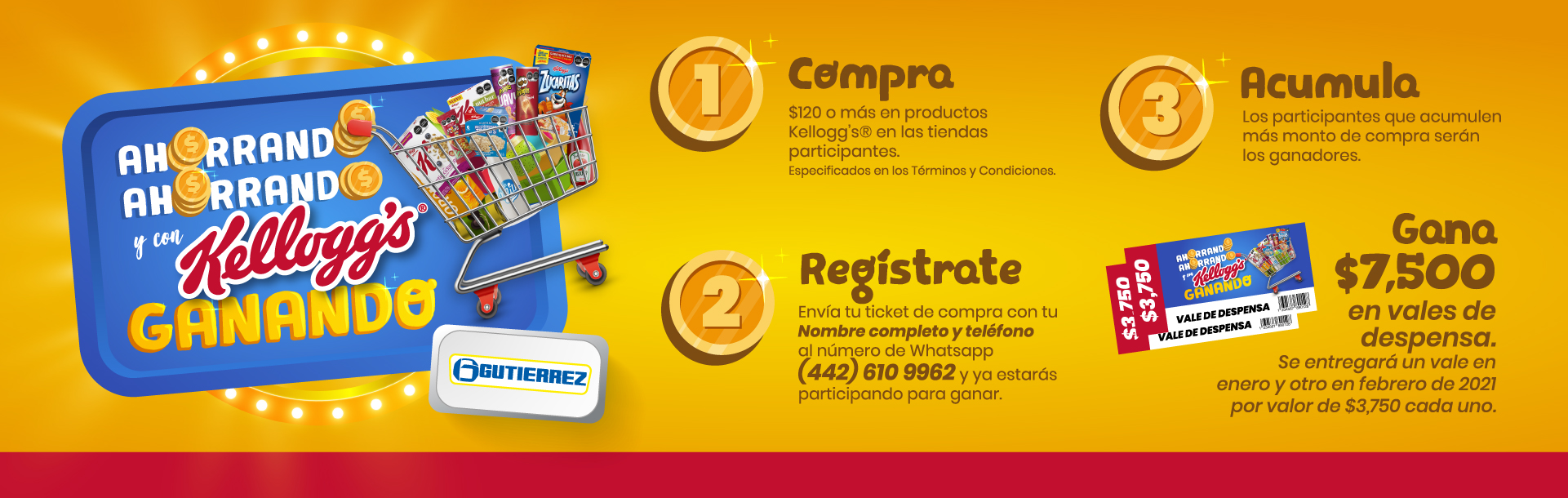 Los términos y condiciones descritos a continuación (las “Bases”) establecen las condiciones y requisitos bajo los cuales se regirá la actividad promocional denominada “AHORRANDO AHORRANDO Y CON KELLOGG’S GANANDO” (en lo sucesivo la “Promoción”). Lo aquí dispuesto es obligatorio para todos los participantes de la Promoción, por lo que se deberá dar lectura total a las presentes Bases. La Promoción se ejecutará a través de una mecánica de acumulación de compra y acumulación de puntajes.